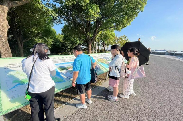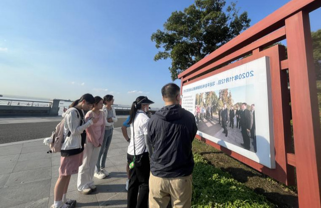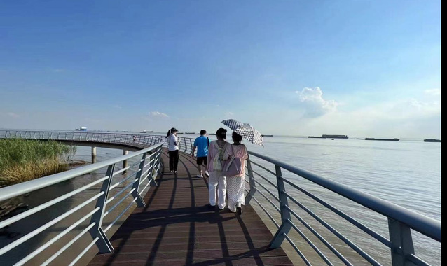 8月2日午后,沐浴于炎炎烈日之下,安徽分队抵达了薛家洼码头广场,亲眼目睹了这里生态环境翻天覆地的变化。站在码头广场眺望远方,海鸥不时在水面上飞掠,远处的徽派建筑映入眼帘,古朴典雅,来自安徽的申嫚同学驻足于此久久不肯离去。“听家乡的老人们说,这里曾是鱼虾难觅、污水横流之地。每当风起,岸边便弥漫着一股不易散去的异味。然而,时光荏苒,当再次踏上这片熟悉的土地时我发现,薛家洼早已脱胎换骨,焕发新生。”
