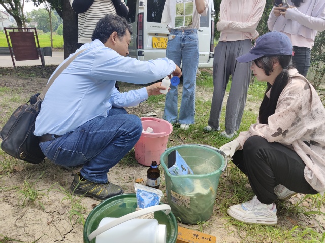 7月21日,温度达到37度,烈日下、河岸边,一片繁忙而有序的景象。在指导老师焦俊鹏的指导下,小组成员分工,迅速而精准地投入到工作中。有的成员手持特制的采集网,小心翼翼地在水面下穿梭,每一次的提拉都满载着对浮游植物样本的期待;有的则拿着笔记本和相机,细致地记录下河岸两侧植被的分布、生长状况,以及那些细微却至关重要的生态细节。汗水顺着他们的脸颊滑落,滴落在脚下的土地上,仿佛是对这片土地最真挚的致敬。