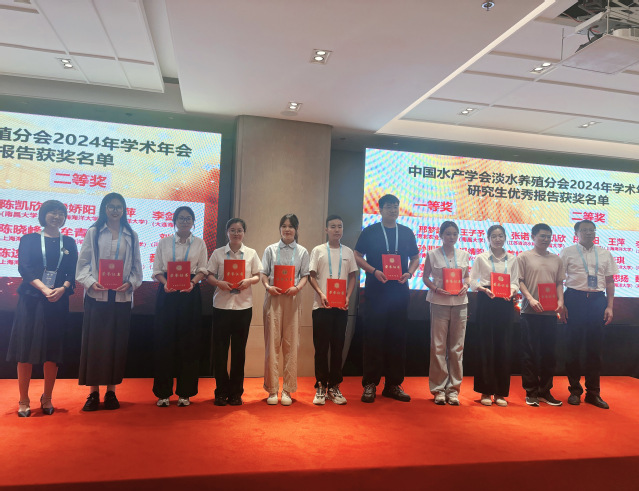 为了营造良好的学术氛围,激励广大研究生求真务实、开拓创新,不断提高水产行业科研水平,本次会议开展了研究生优秀报告评选活动,共评选出一等奖9名、二等奖15名,其中beat365中文官方网站研究生陆婷婷、缪煜琳获得优秀报告一等奖。淡水养殖分会副主任委员王伟、高泽霞共同为获奖研究生颁奖。
