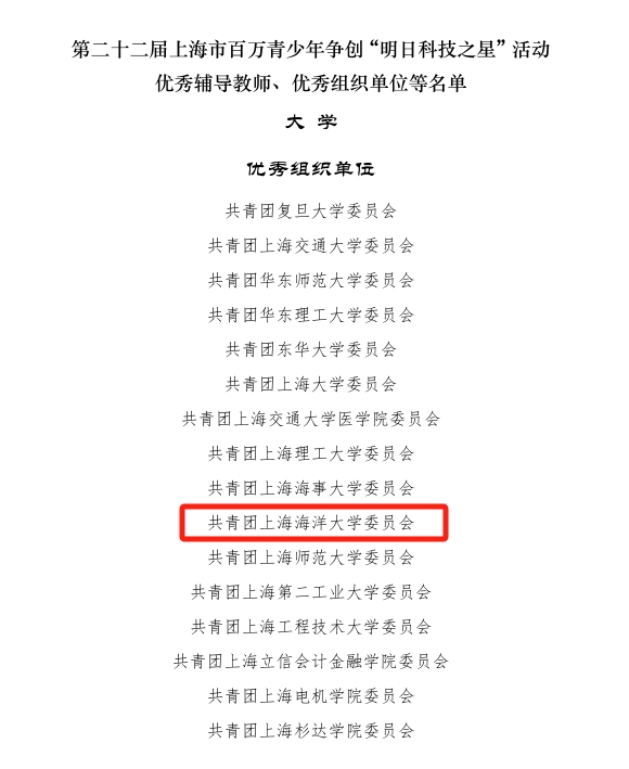 由上海市教育委员会、上海市科学技术委员会和上海科普教育发展基金会联合主办的第二十二届上海市百万青少年争创“明日科技之星”活动赛事结果揭晓。