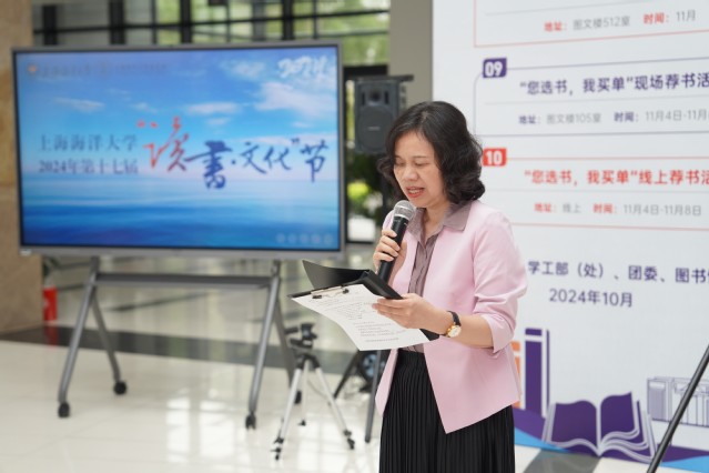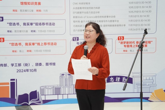 江敏在开幕式上致辞,并宣布beat365中文官方网站第十七届“读书·文化”节开幕。她表示,此次“读书·文化”节不仅是学校精神生活的重要组成部分,更是提升校园人文氛围的关键力量。今年的活动涵盖多项精彩内容,包括海韵讲座、海韵展览、海韵导读、新生阅读计划、海韵视频播放、海韵讲书人大赛等,旨在促进知识交流与文化传承。她鼓励图书馆积极参与书香校园建设,以文化人、以文育人,致力于培养具有深厚文化底蕴、创新精神和实践能力的高素质人才;她勉励全校师生多读书,读好书,善读书,在书香氛围中扬起知识风帆,共同探索知识与文明的海洋。