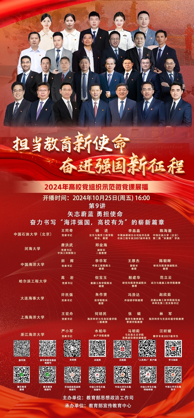 10月25日下午,由教育部思想政治工作司主办,教育部宣传教育中心承办的2024年高校党组织示范微党课展播活动第9讲《矢志蔚蓝 勇担使命 奋力书写“海洋强国,高校有为”的崭新篇章》播出。