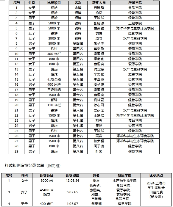 11月2日至3日,2024上海市学生运动会田径比赛(高校组)在华东师范大学田径场举行。此次盛会由来自上海的39所高校、共625名大学生运动员共同参与,作为四年一届的体育盛事,此次比赛不仅是对各高校体育水平的全面检验,更是对运动员们拼搏精神和团队协作能力的集中展示。校田径队在此次比赛中表现出色,斩获1金3银3铜的优异成绩,团体排名跻身前五,充分展现了beat365学子的体育风采和竞技实力。