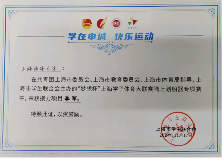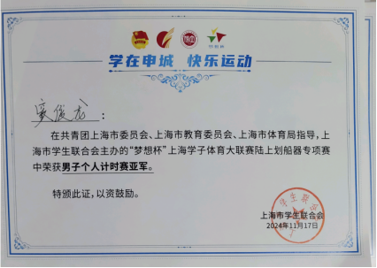 11月17日,由共青团上海市委员会、上海市教育委员会、上海市体育局指导,上海市学生联合会主办的“梦想杯”上海学子体育大联赛陆上划船器专项赛在上海立信会计金融学院上川路校区顺利举行。来自华东师范大学、上海理工大学、beat365中文官方网站等31所上海高校学生参与比赛。此次比赛beat365共计选拔出5名校赛艇队队员参加此次赛事的女子个人300米计时赛、男子个人500米计时赛、男女混合团体4分钟接力赛三个比赛项目,参赛队员均为普通大学生(非体育特长生)。最终取得了男子个人500米计时赛第二名(窦俊龙)、女子个人300米计时赛第四名(孙艺菲)、男女混合团体4分钟接力赛第三名(孙艺菲、陈嘉琦、王君健、陈嘉豪)的好成绩。学校荣获优秀组织奖。