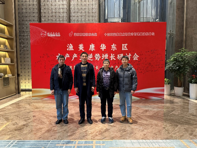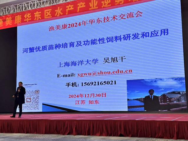 12月30日上午,团队一行参加了渔美康集团举办的“渔美康华东区水产产业逆势增长研讨会”。与会专家、学者围绕江苏虾蟹养殖规模、养殖模式和加工流通现状、国内外渔药研发概况、使用情况、存在问题和发展方向、水产饲料和动保产品等方面进行技术交流。渔美康集团领导做了“2024年养殖效益数据报告”和“渔美康研发概况和新产品介绍”的报告。吴旭干针对“河蟹优质苗种培育及功能性饲料研发和应用情况”作专题介绍。