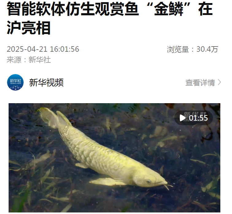 央视新闻以“智能仿生观赏鱼‘金鳞’上市 科技助力生态保护”,报道了仿生鱼的科研成果。