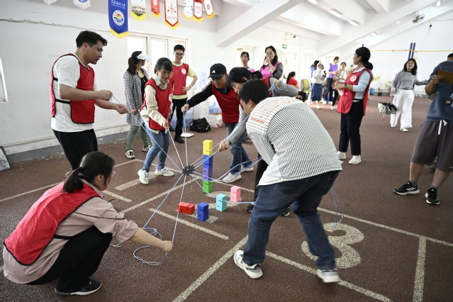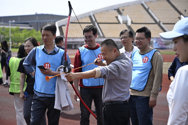 “旱地龙舟”项目中,队员们团结协作,喊着振奋人心的口号,迈着整齐划一的步伐奋力前行,龙舟在他们的推动下,快速地在地面“滑行”,宛如一条条在陆地上飞驰的巨龙。“胸背夹球”项目中,队员们全神贯注地鱼贯而行,小心翼翼地保护着胸前的瑜伽球快速挪动脚步,有的队伍配合默契,如行云流水般快速前进,有的队伍则状况频出,球在行进中不断晃动,引得场边观众时而屏息凝神,时而捧腹大笑。“吸盘射箭”是一项将传统射箭运动与趣味玩法相结合的创意活动,选手们手持弓箭,个个神情专注,有的微微皱眉,仔细瞄准靶心,有的深吸一口气,稳定情绪后果断拉弓射箭,人人争做神射手的架势。“合力筑塔”是一项高度考验团队协作、沟通与策略规划能力的趣味活动,各支队伍全神贯注,队员们目光紧盯吊钩与积木,小心翼翼地拉动绳索,生怕一个失误就让积木掉落,比赛现场,紧张与专注的氛围扑面而来。