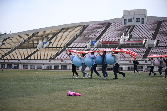 现场,活力四射的学生啦啦操表演精彩登场,出席开幕式的领导和教师们在“九宫格飞盘”体验活动热身后,教职工趣味运动会拉开了帷幕。平日严谨治学的教职工们脱下正装,化身运动健将,在充满趣味的比赛项目中挥洒汗水,展现别样风采。本届趣味运动会保留深受教职工喜爱的团队项目“旱地龙舟”“胸背夹球”,并得到了“浦工乐学”文化配送服务的支持,新增“吸盘射箭”“合力筑塔”两项当前比较流行的团建活动,展现的就是运动员之间的配合和默契,让更多的老师在活动中提高团队协作的意识,增进交流,同时,也达到了锻炼身体的目的。