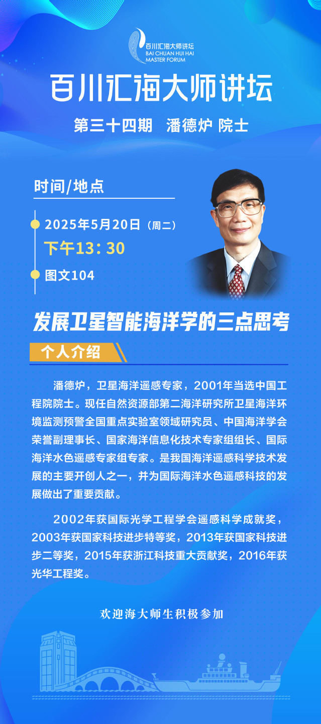 讲座人介绍:潘德炉,卫星海洋遥感专家,2001年当选中国工程院院士。现任自然资源部第二海洋研究所卫星海洋环境监测预警全国重点实验室领域研究员、中国海洋学会荣誉副理事长、国家海洋信息化技术专家组组长、国际海洋水色遥感专家组专家。是我国海洋遥感科学技术发展的主要开创人之一,并为国际海洋水色遥感科技的发展做出了重要贡献。