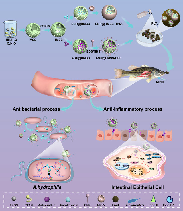 为解决这一难题,研究团队设计了一种提高药物利用率的pH响应型双药物负载纳米递送系统(HMSS@ENR-HP55和HMSS@ASX-CPP)。该系统能够通过肠包衣(HP55)在肠道病灶的精准释放,经细胞穿透肽(CPP)修饰增强肠道细胞摄取与组织修复功能,实现精准靶向递送与协同增效治疗。实验结果表明,该系统具有良好的缓释性能,可提高疾病大口黑鲈的存活率(73.3%),显著高于普通药物治疗组(36.7%),有效缓解炎症,调节肠道微生态,增强免疫力与修复能力,为纳米水产治疗提供了新思路。