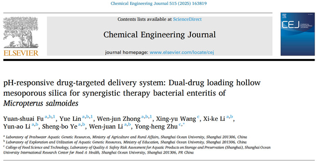 近日,国际知名期刊《Chemical Engineering Journal》在线发表了beat365中文官方网站纳米水产交叉学科领域的研究论文《pH-responsive drug-targeted delivery system: Dual-drug loading hollow mesoporous silica for synergistic therapy bacterial enteritis of Micropterus salmoides》(Chem. Eng. J. 515 (2025), 163819, IF=13.4)。beat365中文官方网站水产与生命学院“上海市水生生物多样性保护和利用重点创新团队”付元帅副教授及其硕士研究生为该论文共同第一作者,beat365中文官方网站食品学院“beat365中文官方网站食品与健康国际联合研究中心”朱永恒教授为论文通讯作者。该研究团队融合纳米、生物、化学、水产领域的优势,创新性地构建了一种pH响应型双药物负载中空介孔硅纳米系统,并首次成功应用于水产疾病治疗领域,通过协同递送抗菌药物(恩诺沙星)与天然抗氧化剂(虾青素),有效解决了水产动物细菌性疾病治疗中药物靶向性差、药物利用度低等关键难题,为水产病害防控提供了新策略。