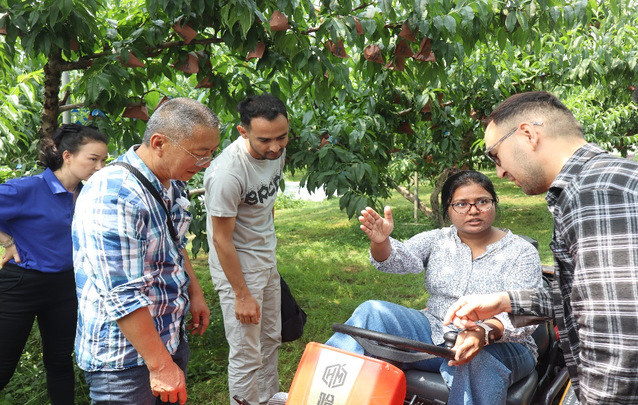 首站,中外学生们走进国家级生态农场——上海市青浦区哈玛匠果园。作为上海市农业科学院乡村振兴示范基地,科技赋能生态农业示范点,哈玛匠果园通过吊杆支架技术、微喷灌溉系统等国际领先的生态种植模式,实现了节水90%以上的高效生产。在农场主黄伟的指导下,来华留学生Esther Baroi(孟加拉国籍)驾驶割草机穿梭于果园,亲身体验智能化农机的便捷;Muhammad Asif(巴基斯坦籍)则在桃林间采摘桃子葡萄等农场主自主培育的品种,聆听农场主现场讲解“看果形、辨色泽、闻香气”的选果秘诀,感受现代智慧农业的魅力。