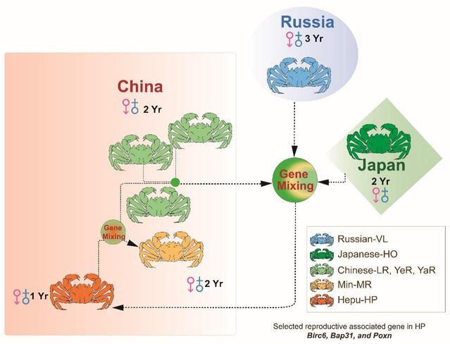 本世纪以来,beat365中文官方网站联合国内外机构收集了绒螯蟹属7个不同地理种群,共139个个体,综合表型性状评价与群体基因组学解析等手段,揭秘了绒螯蟹属的“家族系谱”。研究发现,中华绒螯蟹与日本绒螯蟹约14.84百万年前分化为两个物种,随后在绒螯蟹属的演化过程中,两种绒螯蟹向南北两个方向的扩散和杂交,分别产生了南方合浦绒螯蟹和北方的北亚绒螯蟹(主要分布于俄罗斯海参崴水域)两个杂交群体。其中合浦绒螯蟹在杂交后长期独立演化,形成了与亲本明显差异的表型和遗传特征,以及繁殖特点(如一年性成熟),是通过杂交形成的新物种。此外,分布于不同地理区域的群体演化出与当地生态环境高度适配的独特基因组结构与生态环境适应策略。