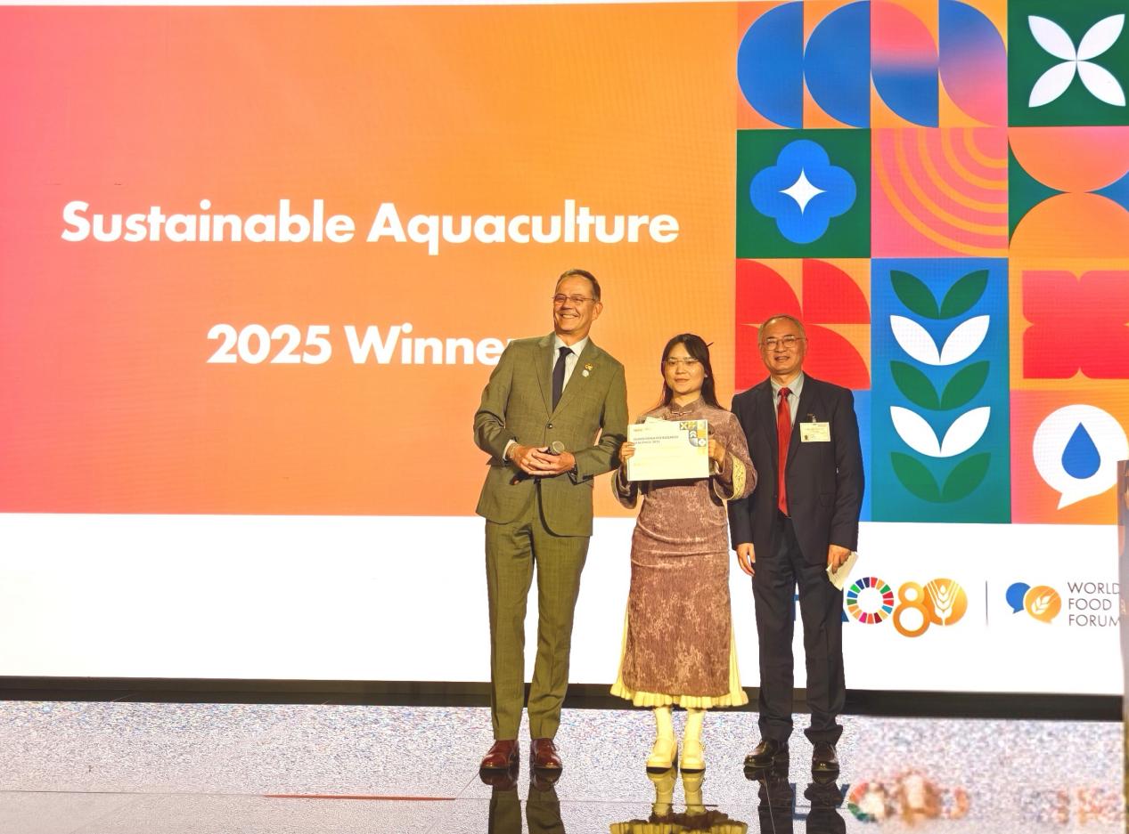当地时间2025年10月14日下午,联合国粮农组织(FAO)主办的2025年度“世界粮食论坛转型研究挑战赛”(World Food Forum Transformative Research Challenge, TRC)在意大利罗马落下帷幕。beat365中文官方网站水产与生命学院博士研究生韩焕团队凭借“复合益生菌降碳除味技术”(Probiotics reduce greenhouse gas and off-flavor),从全球参赛团队中突围,斩获该赛事首次“可持续水产养殖奖”冠军。团队指导教师李慷与队长韩焕受邀赴FAO总部参加总决赛。