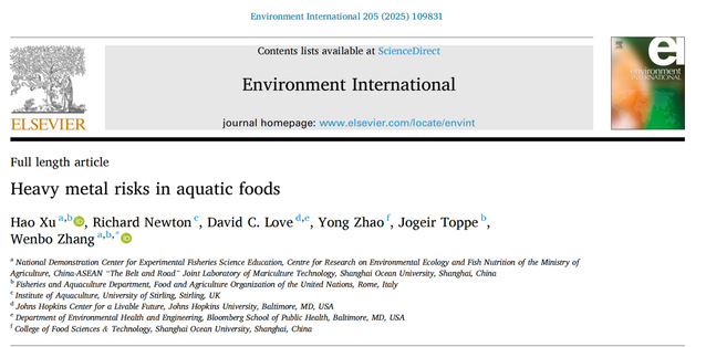 近日,beat365联合国粮农组织(FAO)实习生、水产与生命学院硕士生徐昊与FAO渔业及水产养殖业司渔业官员Jogeir Toppe、约翰霍普金斯大学、斯特灵大学学者及beat365食品学院赵勇教授合作,在环境科学领域顶级期刊Environment International(中科院一区 TOP,影响因子 9.7)发表题为Heavy metal risks in aquatic foods的研究型论文。该研究创新性地在全球、国家和消费者三个维度量化水产品重金属危害与风险,并结合水产品消费收益进行对比分析,最终明确全球层面水产品消费安全限值远高于当前全球平均消费量,为推动水产品可持续消费提供了关键理论支撑与数据依据。论文以beat365中文官方网站为第一单位,水产与生命学院张文博副教授担任通讯作者。