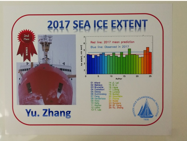 According to the tradition of theconference, the Organizing Committee of the conference will require allparticipating experts and scholars to submit their own predications on thecoverage area, the time of the minimum value and the distribution of the seaice during the rapid thawing period of the Arctic ice two years from theconference based on their own studies and will announce the final results atthe meeting two years later. SOU Teacher Zhang Yu submitted his predication on themelting of sea ice in 2017 at the 2015 meeting and eventually stood out fromhundreds of participants from all over the world with his results very close tothe actual sea ice coverage and was awarded the second prize for hispredicative study on the Arctic sea ice change.